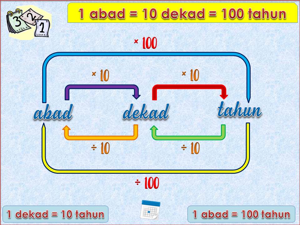 Definisi tahun, dekad, abad dan alaf • tahun : Jangka masa yang lamanya dua belas bulan • dekad : Jangka masa sepuluh tahun • abad : Kaedah mudah tak perlu darab dan bahagi untuk tukar unit masa melibatkan tahun dekad dan abad. Berapa tahun usia mobil kakak?